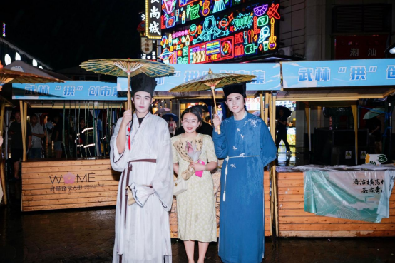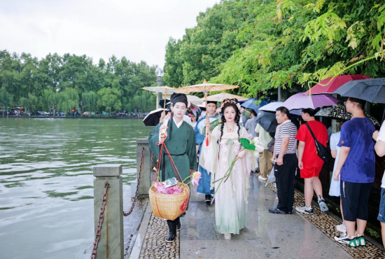 从武林夜市到西子湖畔,几位身着宋制汉服的真人NPC吸引了不少市民驻足欣赏。来自金湖的挑花郎、荷花仙子,携新鲜采摘、包装精美的荷花,通过互动问答,随缘赠送游客。