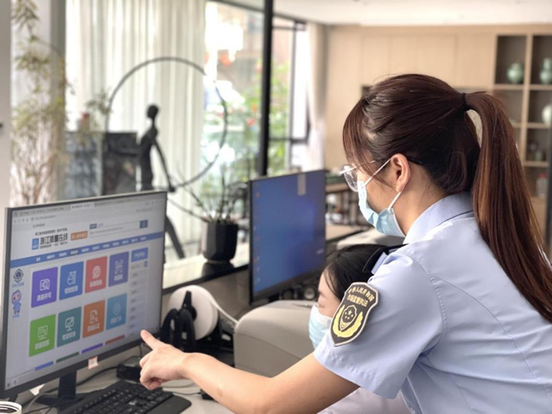 温州市鹿城区市场监管局丰门所执法人员指导鞋企负责人在“浙江质量在线”平台填报企业信息。