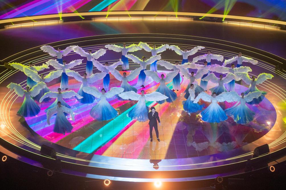 6月15日,亚运会倒计时百天主题活动在杭州举行,图为歌手与演员表演歌曲《同爱同在》。新华社记者 江汉 摄