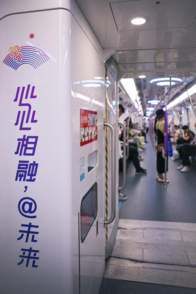 这是9月5日拍摄的杭州地铁“亚运号”专列内装饰的杭州亚运会口号。新华社记者 江汉 摄