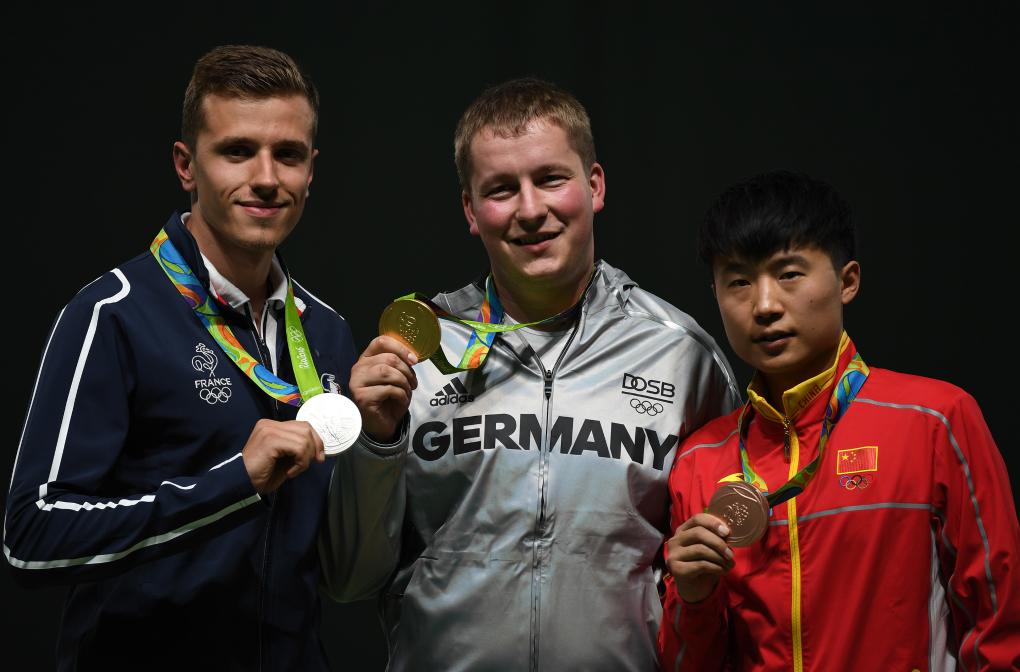 在2016年里约奥运会射击男子25米手枪速射决赛中,德国选手雷茨(中)以34中的成绩夺得冠军,法国选手基康普瓦和中国选手李越宏(右)分获亚军和季军。新华社记者 韩瑜庆 摄