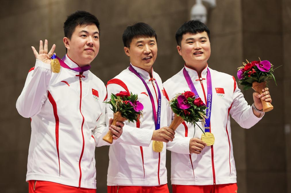 9月25日,中国队选手李越宏(中)、刘杨攀(右)、王鑫杰在颁奖仪式上。新华社记者 单宇琦 摄