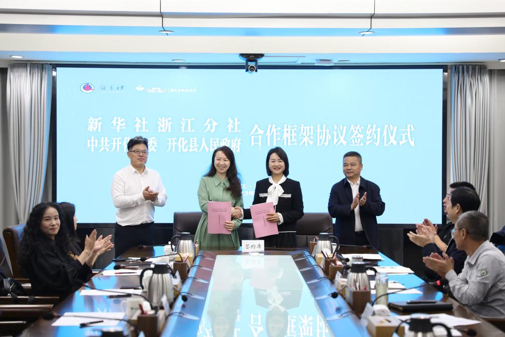 新华网杭州10月22日电 新华社浙江分社与开化县委、县政府19日签订合作框架协议。新华社浙江分社社长邬焕庆、副社长张乐,开化县领导夏盛民、吕燕、汪长林出席签约仪式。