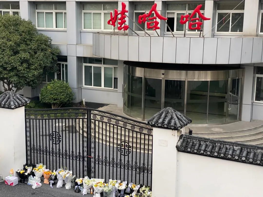 因2023年末,娃哈哈集团总部已经搬至新大楼,这里大门紧闭。但铁门下,已整齐放满一排市民自发送来的鲜花。时而,还有外卖小哥将AD钙奶、娃哈哈纯净水等招牌产品送来,认真鞠躬后轻轻放在鲜花旁。