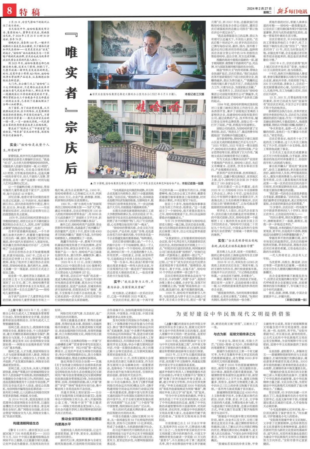 暂且放下“饮料大王”“中国首富”这些标签,“唯实者”宗庆后的形象,深深烙印在记者脑海中。