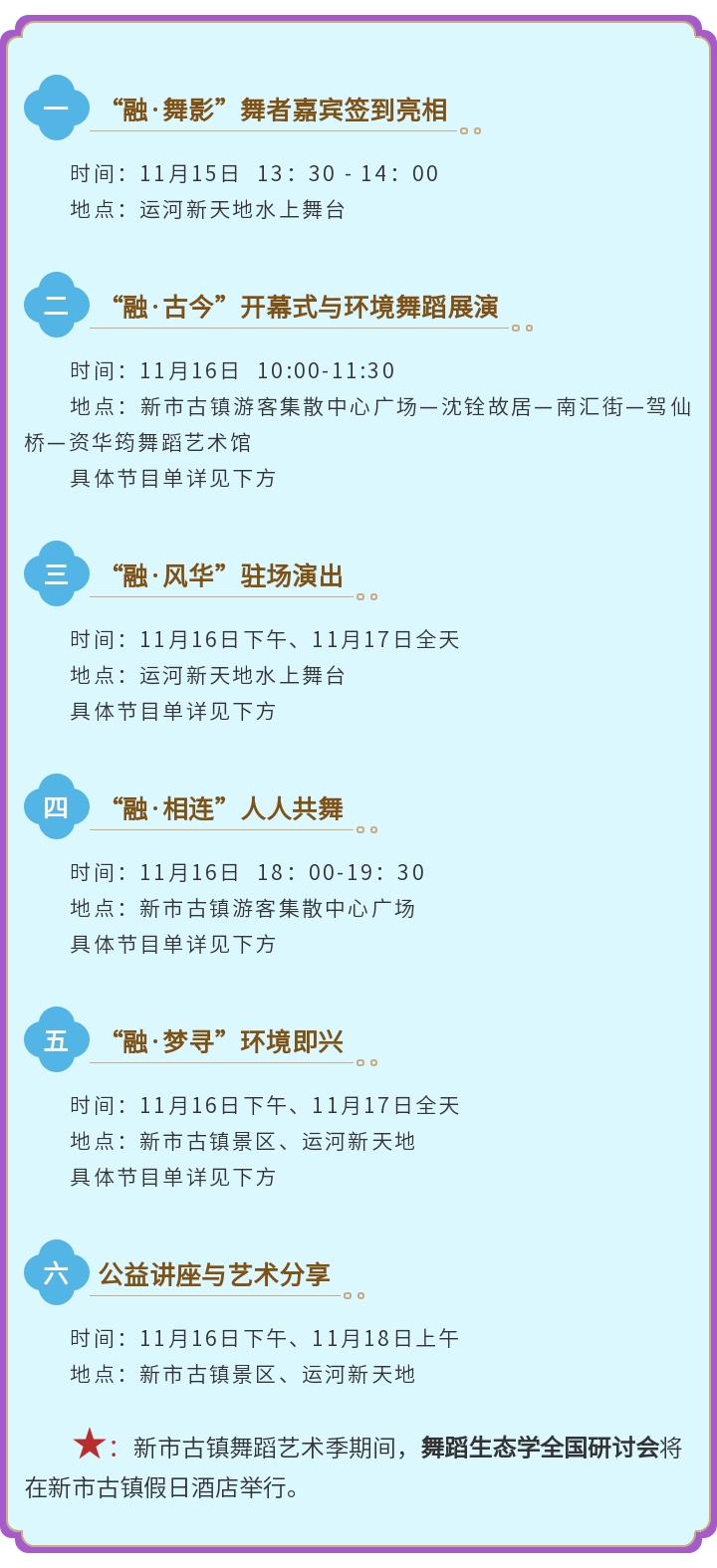 11月16日-11月18日,新市古镇舞蹈艺术季即将举行。届时,开幕式及环境舞蹈展演“融·古今”、驻场演出“融·风华”、人人共舞“融·相连”、环境即兴“融·梦寻”等一系列全新的艺术展演形式,将在新市古镇精彩上演。