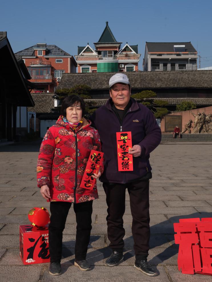 早上8点半,村民曹凤彪带着夫人与两个孩子走进摄影棚,手里举起“新年快乐”的牌子和糖葫芦道具,一家人笑容满面、其乐融融。随着一声“茄子”响起,当天第一组全家福诞生了。“很久没有拍过全家福了,这次趁着女儿放寒假回来,正好有机会增加新年的仪式感。”曹凤彪说。