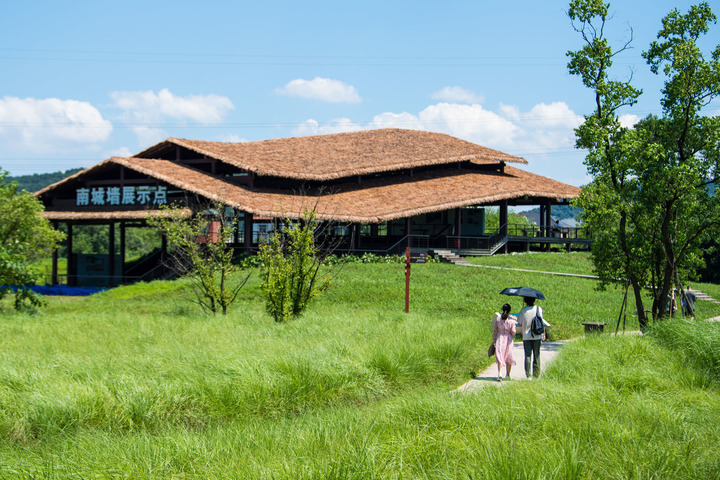 7月4日,游客在杭州良渚古城遗址公园南城墙遗址展示点游览。新华社记者 江汉 摄