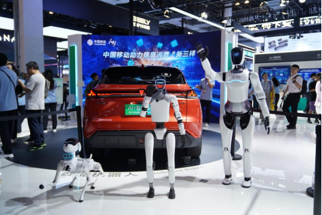 步入中国移动展区,一场由“灵犀”机器人家族联袂主演的“联欢会”正在上演。从动作整齐划一的群体迎宾到灵动默契的群舞互动,再到致敬经典机器人表演《虎口遐想》相声环节,科技与传统的交融将现场氛围推向高潮。在“新三样”展区附近,还能随机触发特别演出,中尺寸机器人用高超洒脱的舞步演绎机械舞,将工业美学的刚劲与舞蹈艺术的柔美完美融合,为观众呈现赛博朋克风格的视觉盛宴。