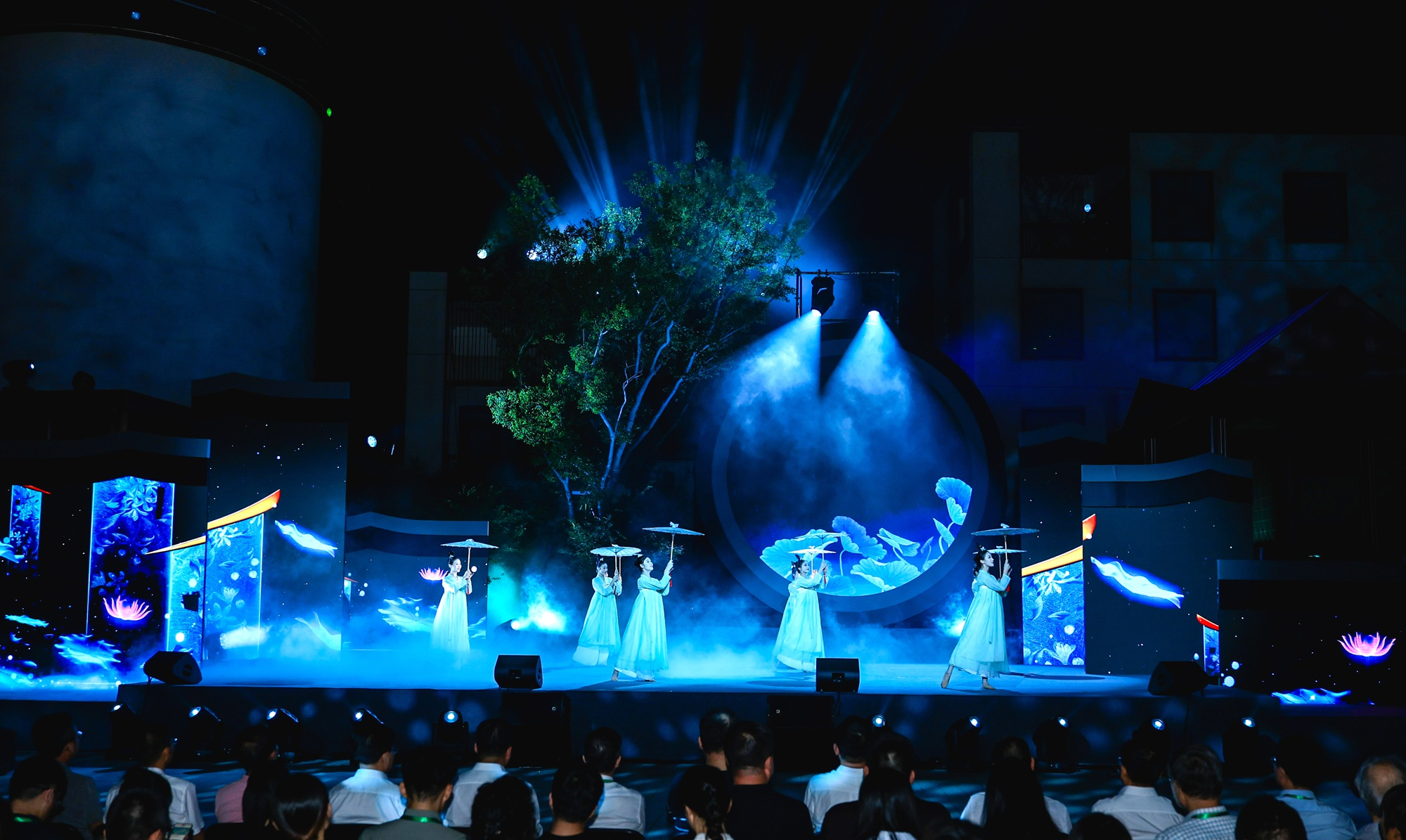 本届展演通过沉浸式舞台设计,以“田歌声声,善迎天下”为主题,通过“春耕·遇”“夏耘·恋”“秋收·竞”“冬藏·归”四个篇章,勾勒出一幅“水漾长歌”的江南画卷。