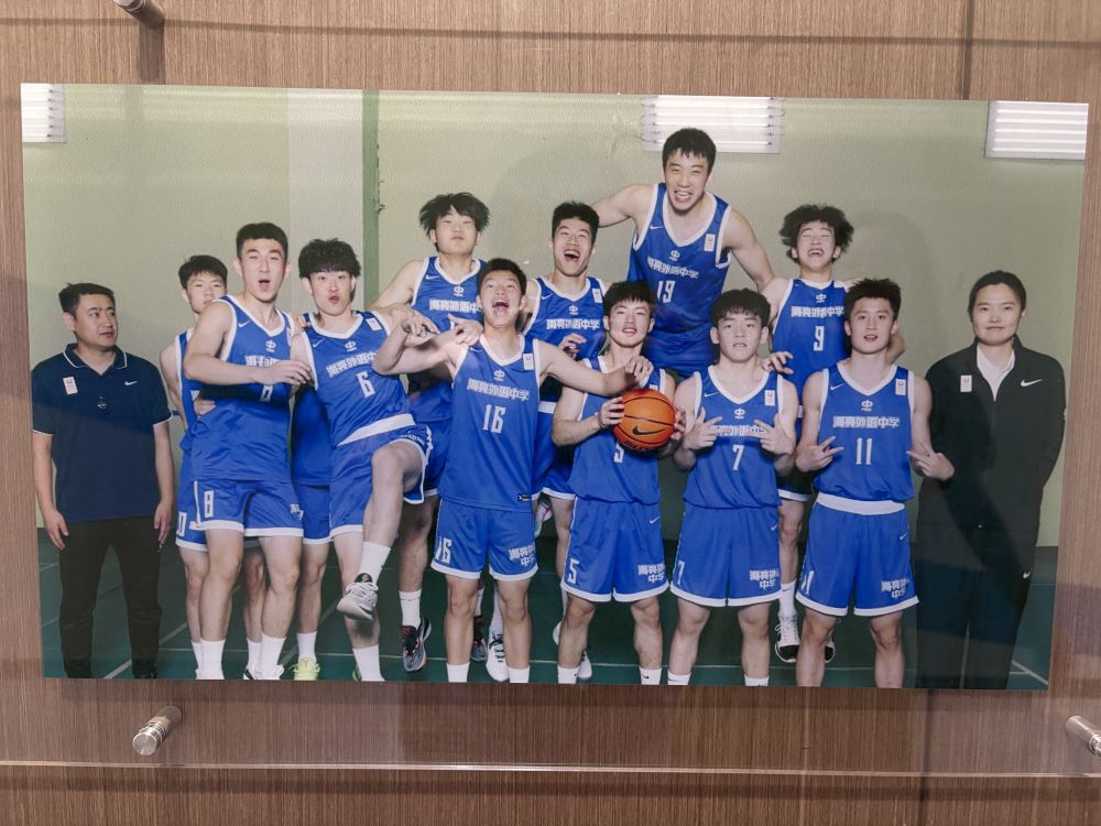馆内,海亮外语中学篮球队的队员们在教练的指导下,分成两组训练。球鞋和地板摩擦发出的吱吱声响在球馆上空飘荡,而陪伴他们的是球馆中央静静悬挂的全国冠军旗帜。