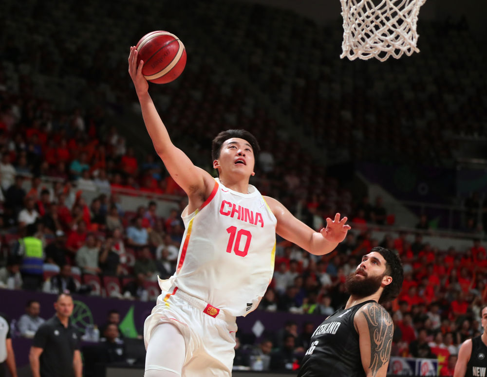 8月16日,中国队球员王俊杰(上)在2025国际篮联亚洲杯半决赛中。新华社记者 王东震 摄