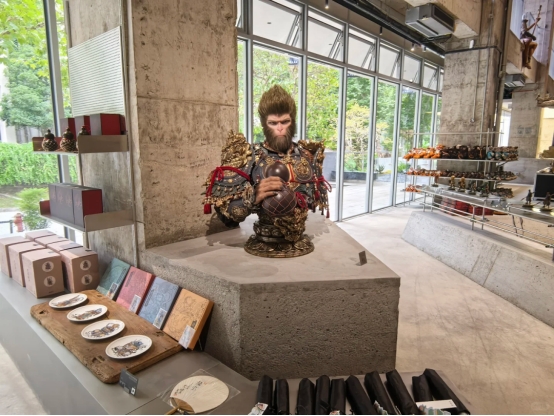店铺总面积约1000平方米,分为上下两层,采用展品与商品穿插陈列的方式,使整个空间兼具零售功能与美术馆气质,细微之处亦隐藏诸多游戏彩蛋,待玩家探索发现。除购物功能外,该店更是一个集零售、体验与餐饮于一体的综合文化空间。店内推出多款主题甜品与饮品,契合年轻人喜爱打卡的“小确幸”文化。二楼走廊区域被打造为小型艺术展区,陈列了此前黑神话与中国美术学院艺术展中的部分作品。这种艺术、文化与商业的融合模式,为玩家带来超越普通周边购物的沉浸式体验,也与周边区域浓厚的文艺氛围相呼应。