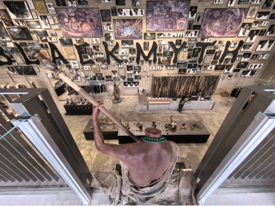 店铺坐落于转塘街道艺创小镇凤凰创意国际C3幢,营业时间为每周一至周日10:30-18:30。步入店内,瞬间被浓郁的暗黑国风美学包围。店内整体设计延续了游戏独特的视觉风格,巧妙地将虚拟艺术转化为实体体验。其中,钟馗骑虎大型装置尤为醒目,造型威严、细节精致,尽显游戏角色的磅礴气势,也体现出游戏科学对细节的精准把控。