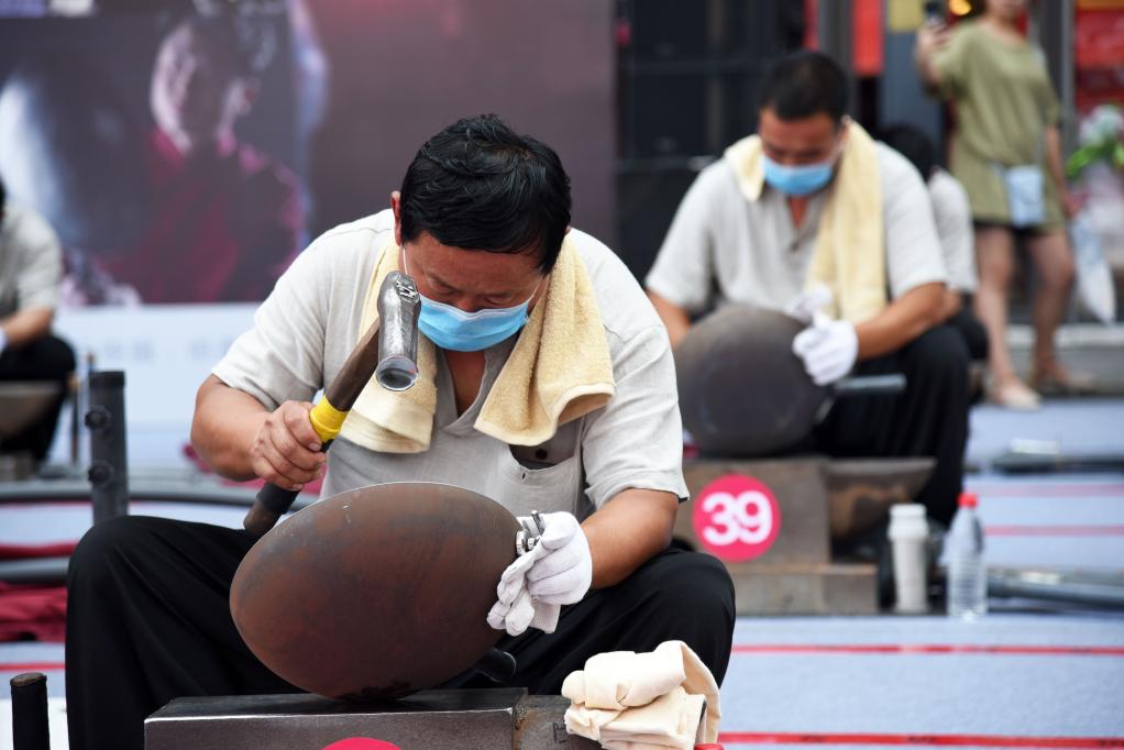 章丘打锅工匠演示章丘铁锅的冷锻技艺。新华社记者 王凯 摄