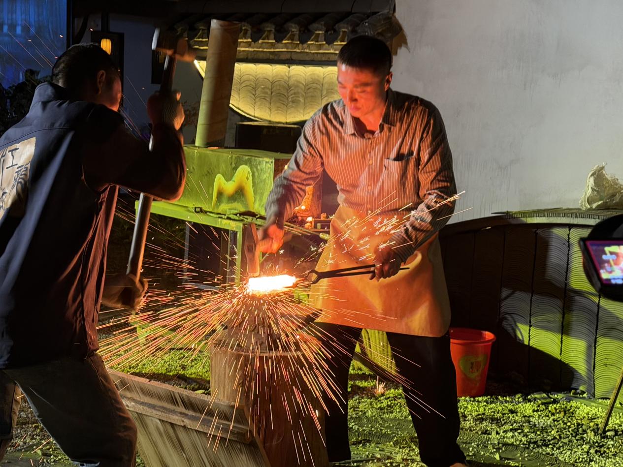 龙泉西街历史文化街区上演宝剑锻打展演,尽赏龙泉宝剑非遗魅力。凌翎/摄