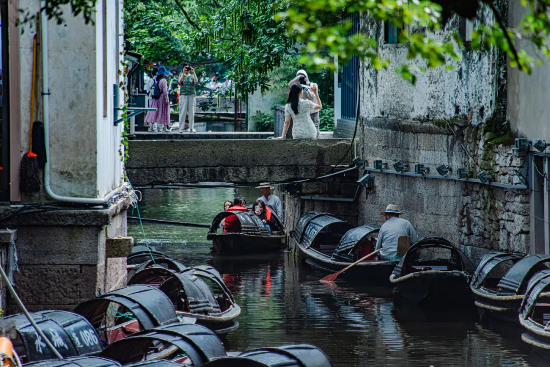 有人说,这乌篷船成了“网红”,会不会变了味道,丢了“本”?答案是,从未。船工控船捉桨的技巧,是传了几代的老手艺,那支嵌在船尾的桨,需用脚精准踏蹬,力道匀了,船才走得稳。乌篷的布料还是用传统的桐油浸过的,防水耐用还带着点油香。就连船里的小凳子,也是照着几十年前的样子打的,坐上去还能感觉到木头的温度。船尾的橹更是老物件,木纹里浸着百年的水色,船工握在手里转、摇,每一下都透着熟稔。