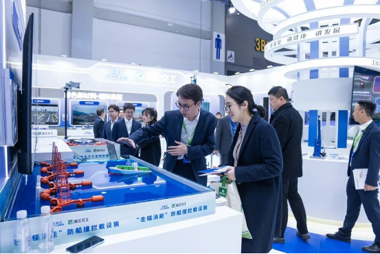 在智慧养护展区,桥梁防船撞设施模型正循环演示其工作过程。“传统防撞思路是‘硬碰硬’,而我们转向‘柔克刚’——既要护桥安全,也最大限度降低船舶损伤。”现场解说员讲解道。这套被称为桥梁“海上安全卫士”的系统,创新采用“拦阻网初步拦截+系泊锚与消能锚分级走锚”设计,通过锚块与海床摩擦,逐步消解船舶撞击动能,实现“以柔克刚”的防护效果。