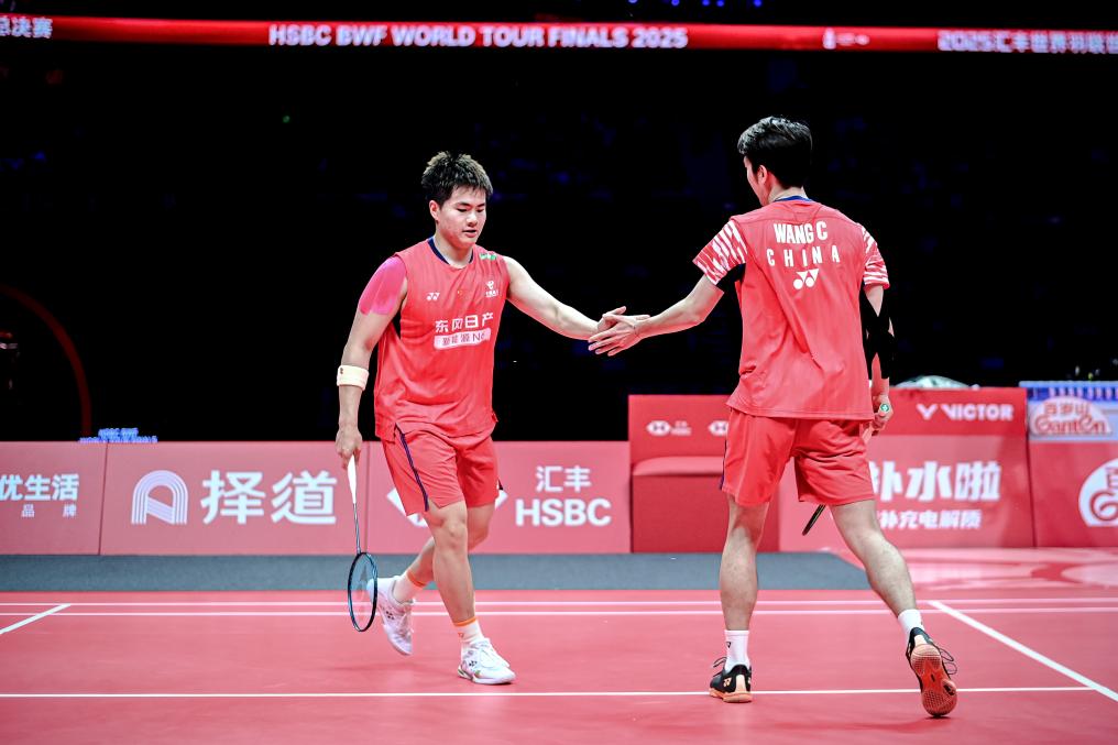 12月21日,中国组合梁伟铿(左)/王昶在决赛中庆祝得分。当日,在杭州进行的2025世界羽联世界巡回赛总决赛男子双打决赛中,中国组合梁伟铿/王昶0比2不敌韩国组合金元昊/徐承宰,获得亚军。新华社记者 江汉 摄