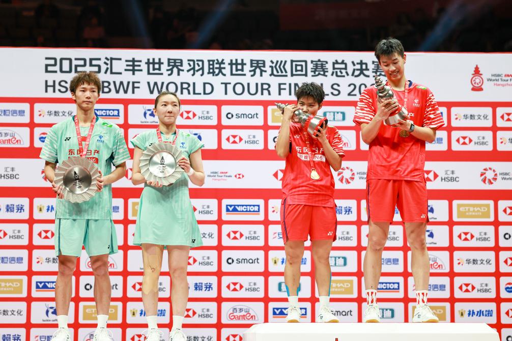 12月21日,冠军中国组合冯彦哲(右一)/黄东萍(右二)、亚军中国组合蒋振邦(左一)/魏雅欣在颁奖仪式上。当日,在杭州进行的2025世界羽联世界巡回赛总决赛混双决赛中,中国组合冯彦哲/黄东萍2比0战胜另一对中国组合蒋振邦/魏雅欣,夺得冠军。新华社记者 江汉 摄