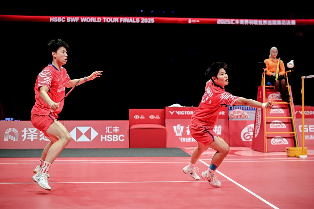 12月21日,冯彦哲/黄东萍(右)在比赛中。当日,在杭州进行的2025世界羽联世界巡回赛总决赛混双决赛中,中国组合冯彦哲/黄东萍2比0战胜另一对中国组合蒋振邦/魏雅欣,夺得冠军。新华社记者 江汉 摄