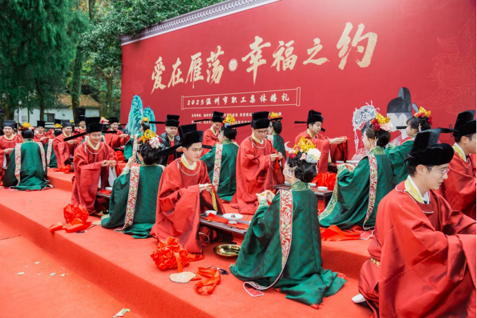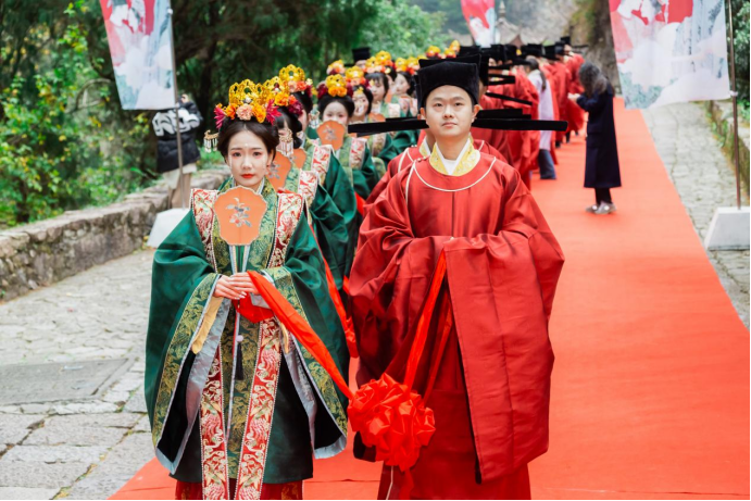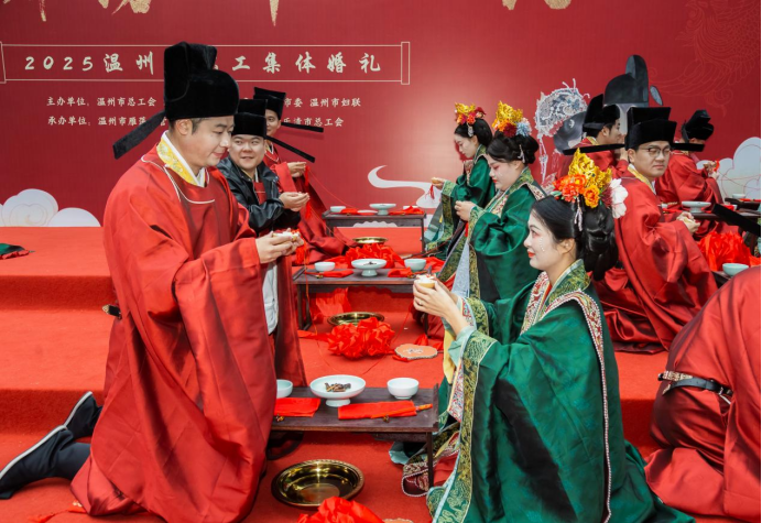 饮合卺酒、行结发礼、互赠信物、证婚人证婚、颁发结婚证书、发放纪念礼包……在主持人的引导下,新人们一步步沉浸式体验传统中式婚嫁仪式,共同翻开人生幸福新篇章。他们中,既有土生土长的温州人,也有来自五湖四海的“新温州人”,涵盖企业职工、创客、医护、教师等行业。