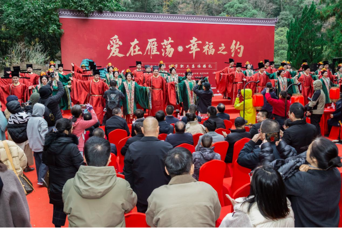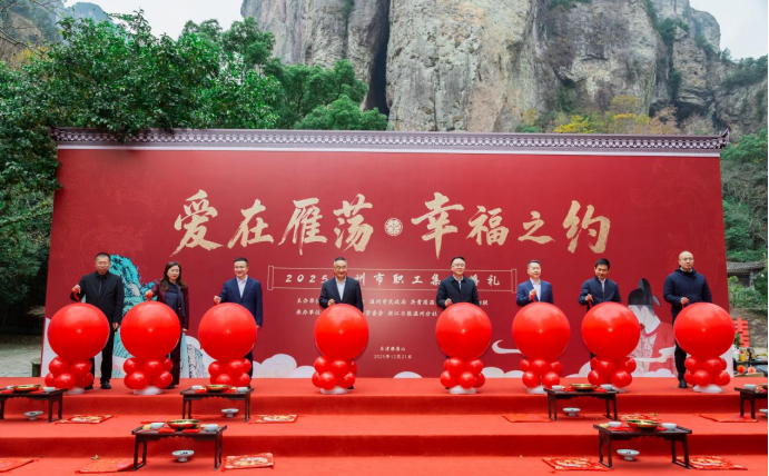 12月21日,“爱在雁荡·幸福之约”2025温州市职工集体婚礼在浙江温州乐清市雁荡山“夫妻峰”下举行,20对扎根温州的青年职工,以传统中式婚礼仪式喜结连理,许下相伴一生的誓言。