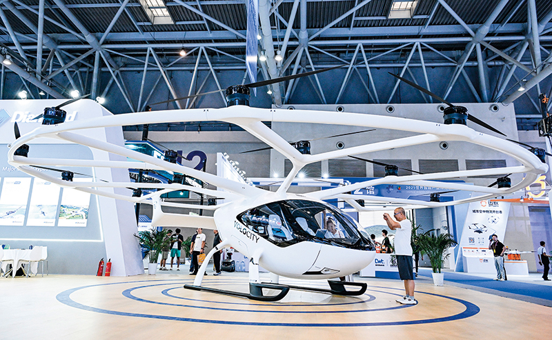 观众在重庆举办的2025世界智能产业博览会上参观电动垂直起降飞行器(2025年9月5日摄) 王全超摄 / 本刊