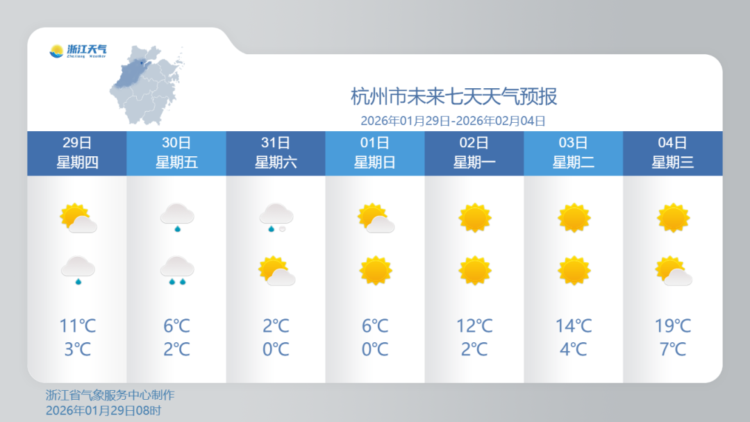 明天气温开始下降。白天降温最明显出现在31日(周六),浙北地区降至2~5℃、其他大部地区7~10℃。