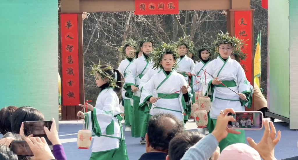 上午,梧桐祖殿内钟鸣二十四响,殿外鼓震二十四声,象征二十四节气循环。先锋号角长鸣、立春旗升起,孩童与舞者缓缓入场,恭祭春神。