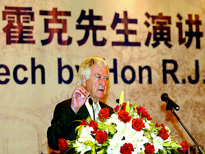 会见后,在市领导叶明、安志云、陈振濂等陪同下,霍克在“雷迪森”作了有关国际形势和中国加入WTO的演讲。他为杭州的听众分析了当前的国际政治、经济形势,对中国加入WTO后的前景十分乐观。他看好杭州的发展,认为杭州能成为中国轻工业的基地之一,在纺织、机械、电子、服装等行业都取得很大成功。杭州的企业可以与澳大利亚的企业合作,在食品、零售商业方面可能有所作为,因为中国的生活水平在增长。澳大利亚的环保方面有着先进的技术和经验,中国应该向他们学习。同时,针对中国的留学热,霍克认为中国的教育不应太多地效仿外国教育的做法。中国有很好的学风,中国的教育方式也很好。可以吸取国外教育的精华,去其糟粕。中国的大学可以与国外的大学进行交流,吸取更多的长处。