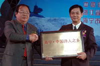 [新华网播报员现场播报]:(领导和嘉宾入座) 海宁电视台主持人:下面举行中国诗人之乡命名授牌仪式。 有请中国诗歌学会秘书长张同吾先生宣读命名文件。 (宣读完毕,入座) 有请中国作家协会书记处书记、中国诗歌学会常务副会长吉狄马加先生向海宁市授予中国诗人之乡牌匾,请中共海宁市委常委、宣传部长朱祥华先生代表海宁市接牌。 |