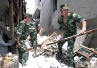边防官兵清理受灾地区
